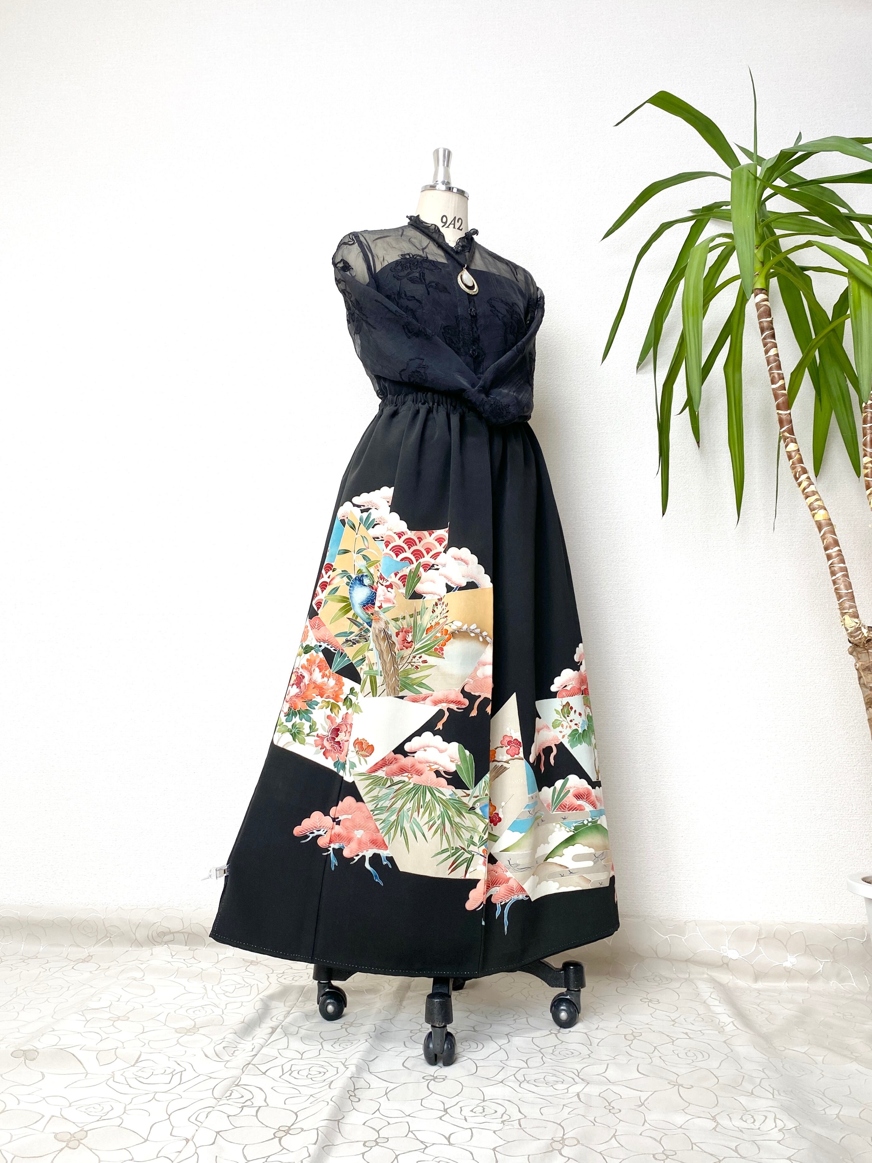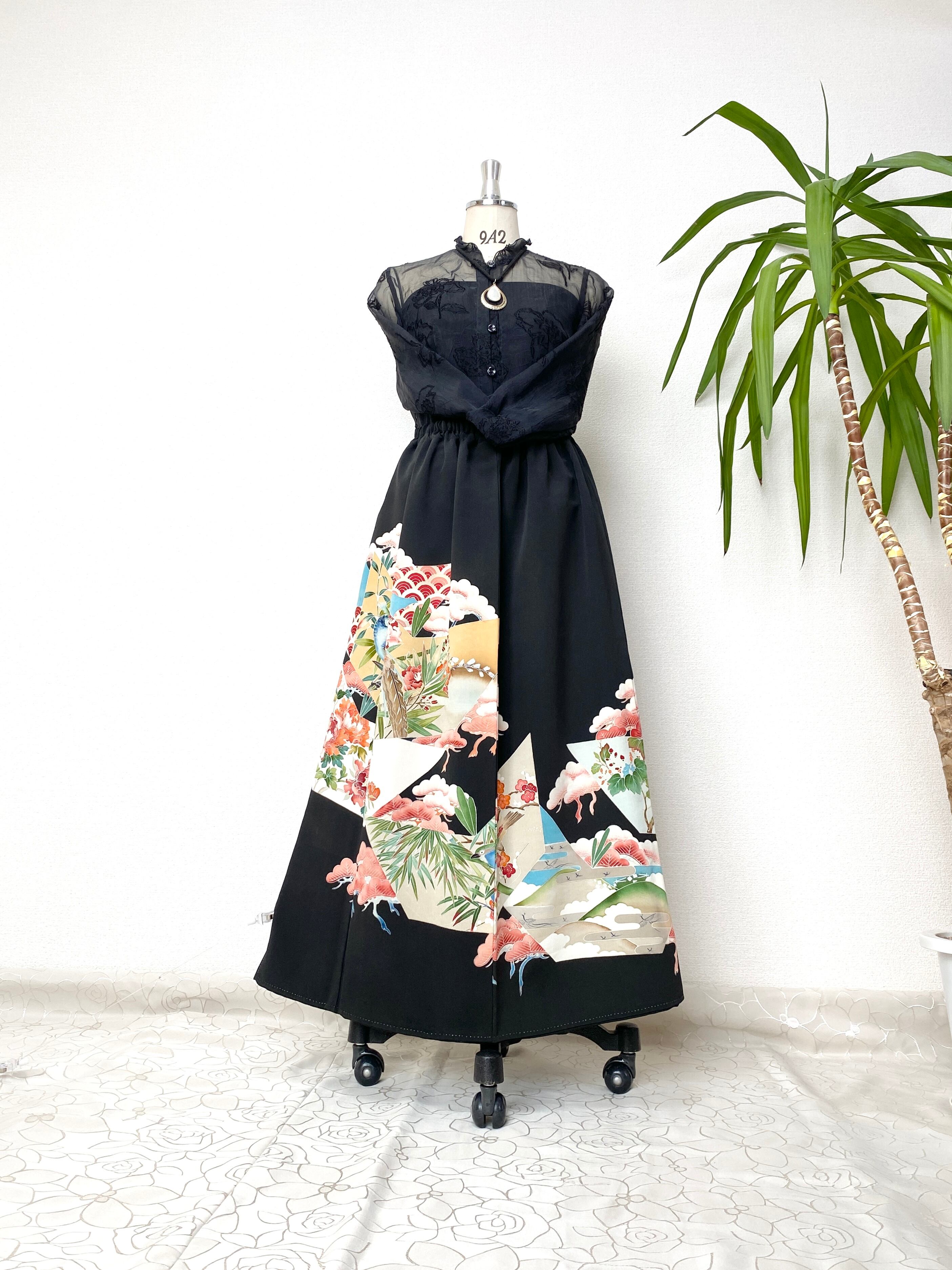 大人可愛いセレブ着物スカートフリーサイズ黒留袖着物リメイクウエストゴムロングスカート