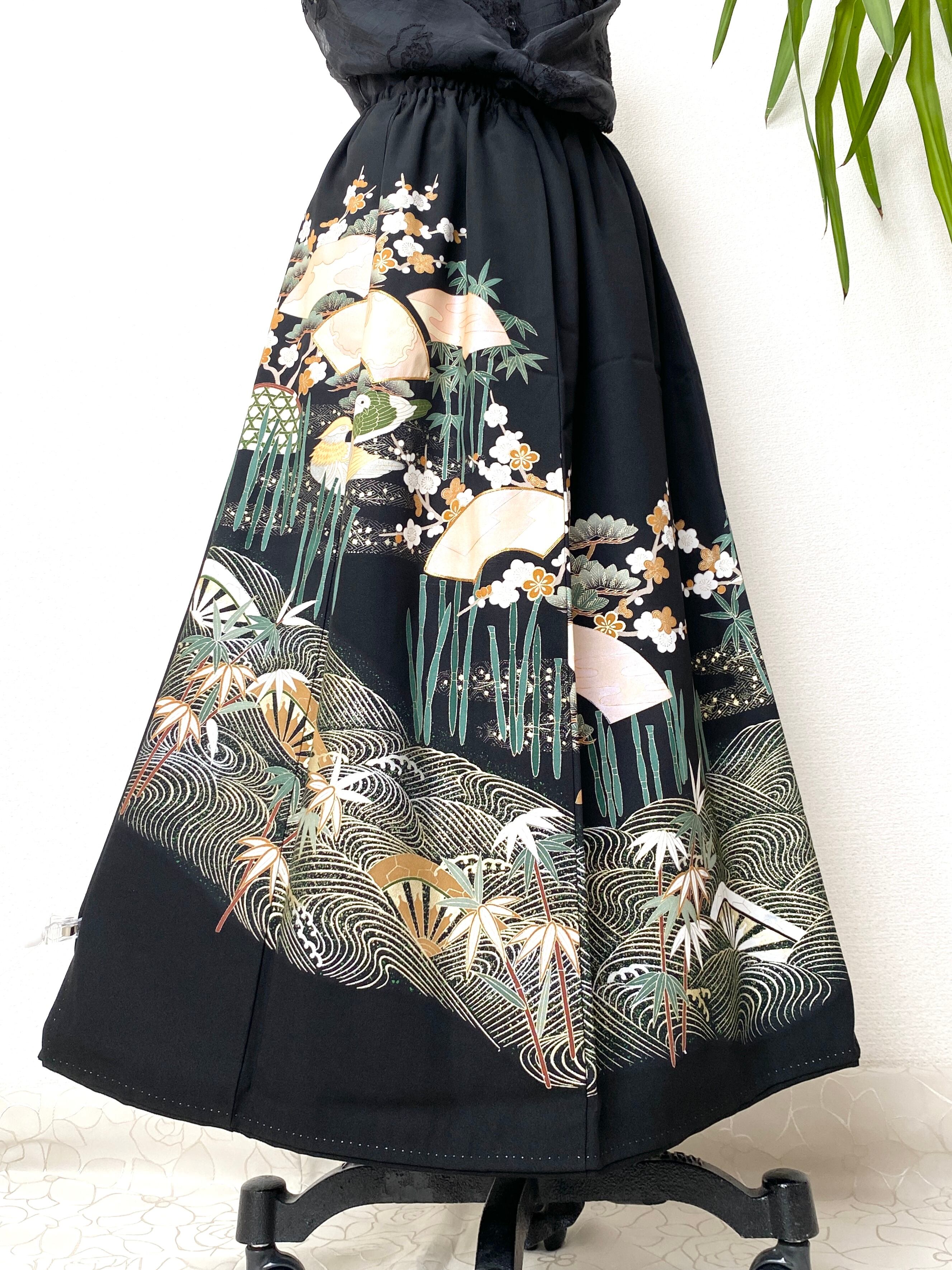 大人可愛いセレブ着物スカートフリーサイズ黒留袖着物リメイクウエストゴムロングスカート