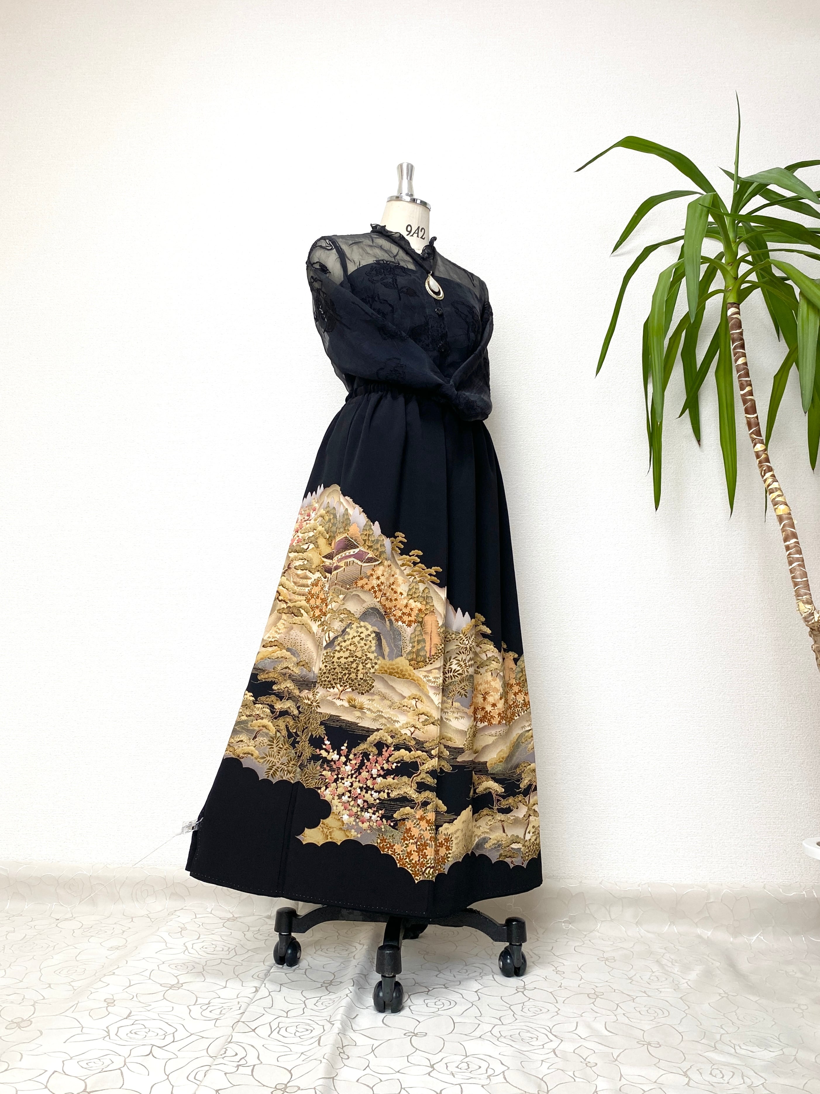 大人可愛いセレブ着物スカートフリーサイズ黒留袖着物リメイクウエストゴムロングスカート