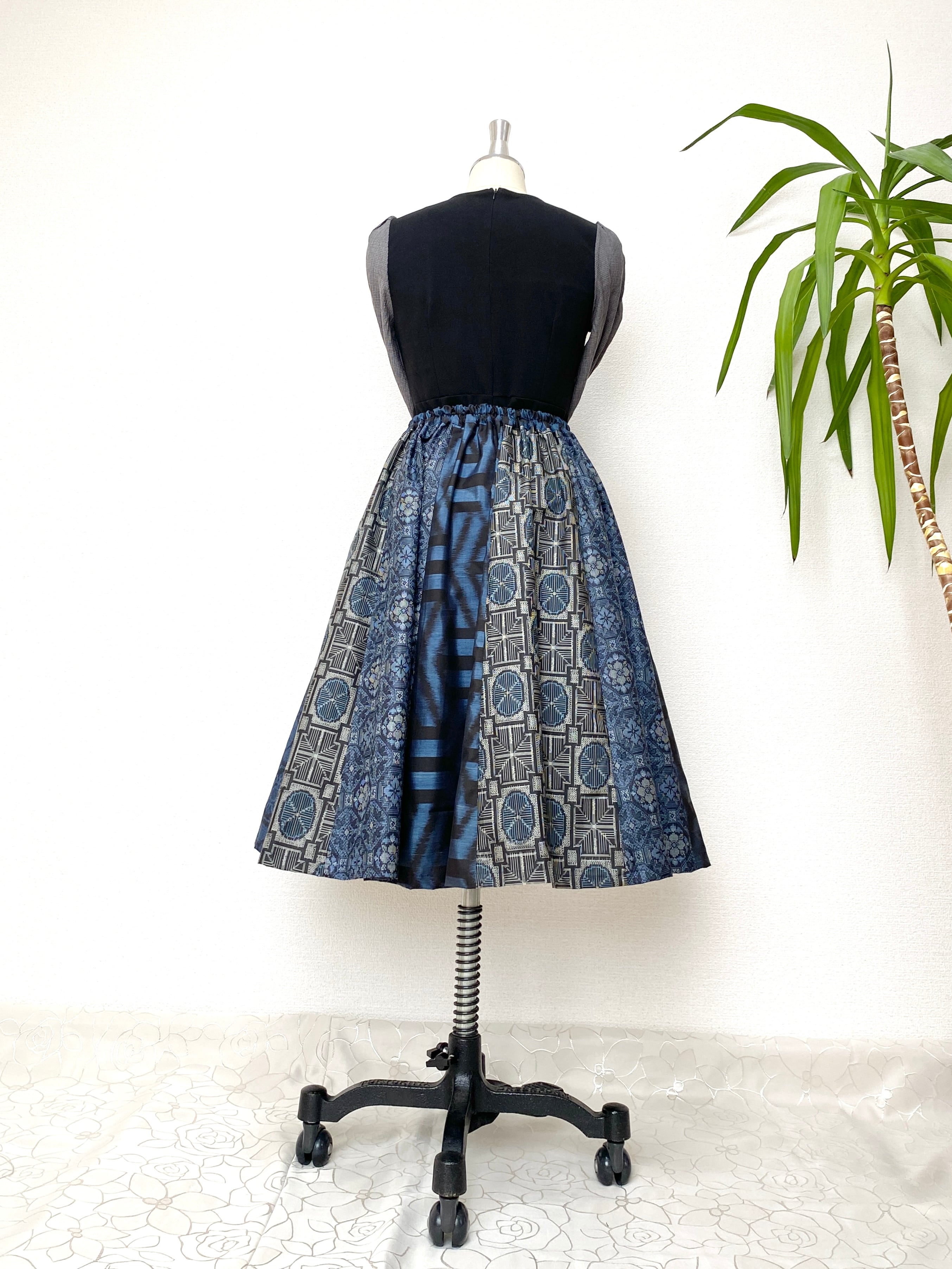 大島の着物をリメイクして作製したウエストゴムロングドレススカートフリーサイズです。