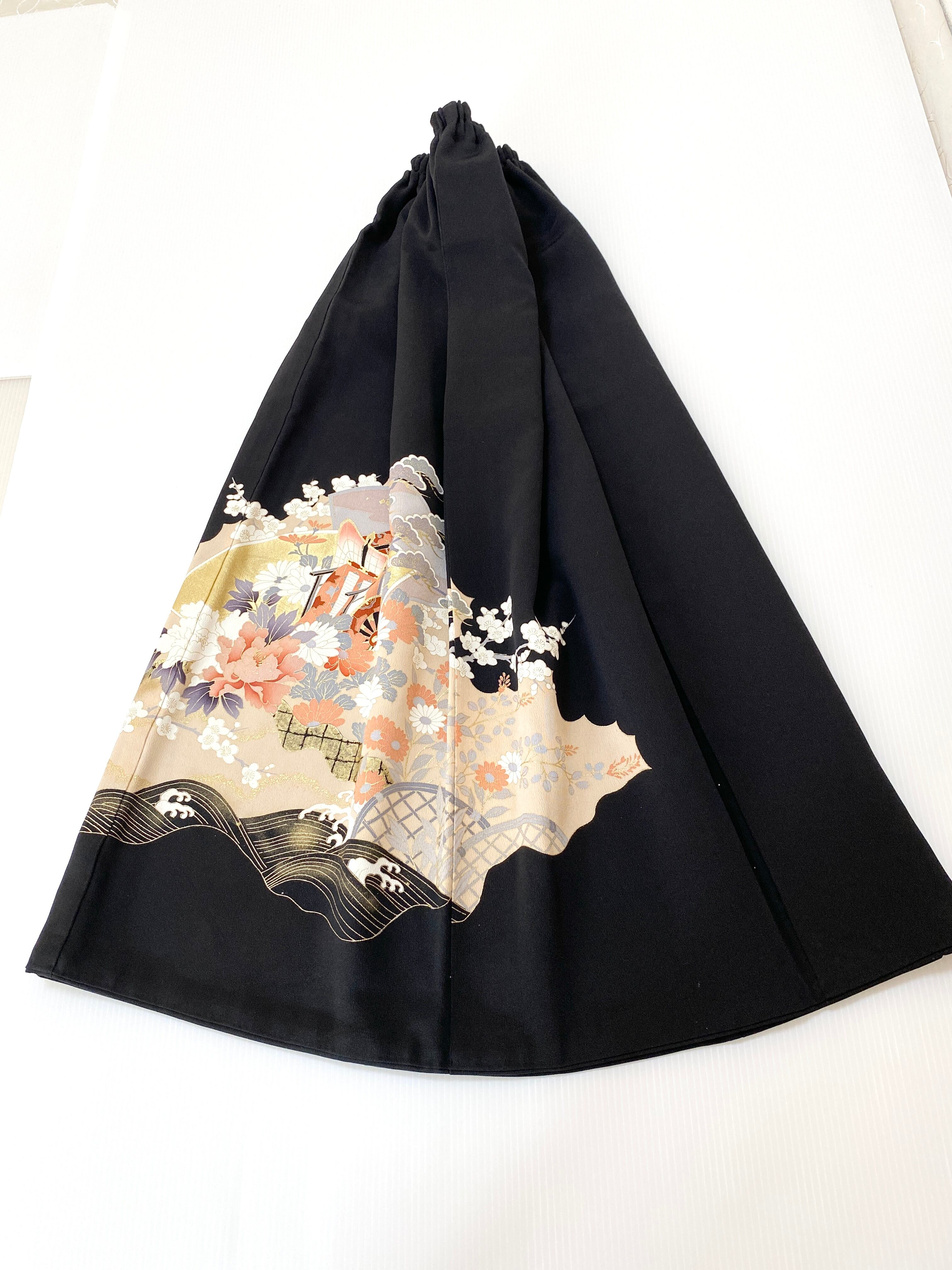 大人可愛いセレブ着物スカートフリーサイズ黒留袖着物リメイクウエストゴムロングスカート